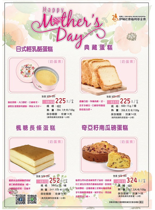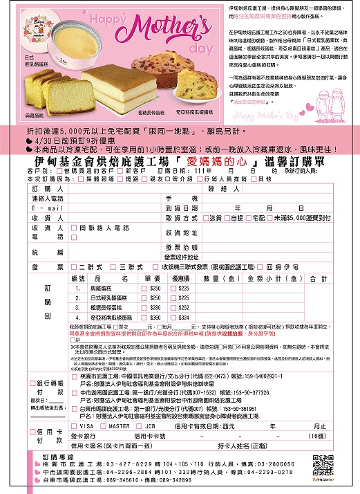 轉知:「財團法人伊甸社會福利基金會附設伊甸烘焙咖啡屋111年母親節蛋糕禮盒產品宣傳單1份,敬請廣為宣導並支持採購,以促進身心障礙者就業。」