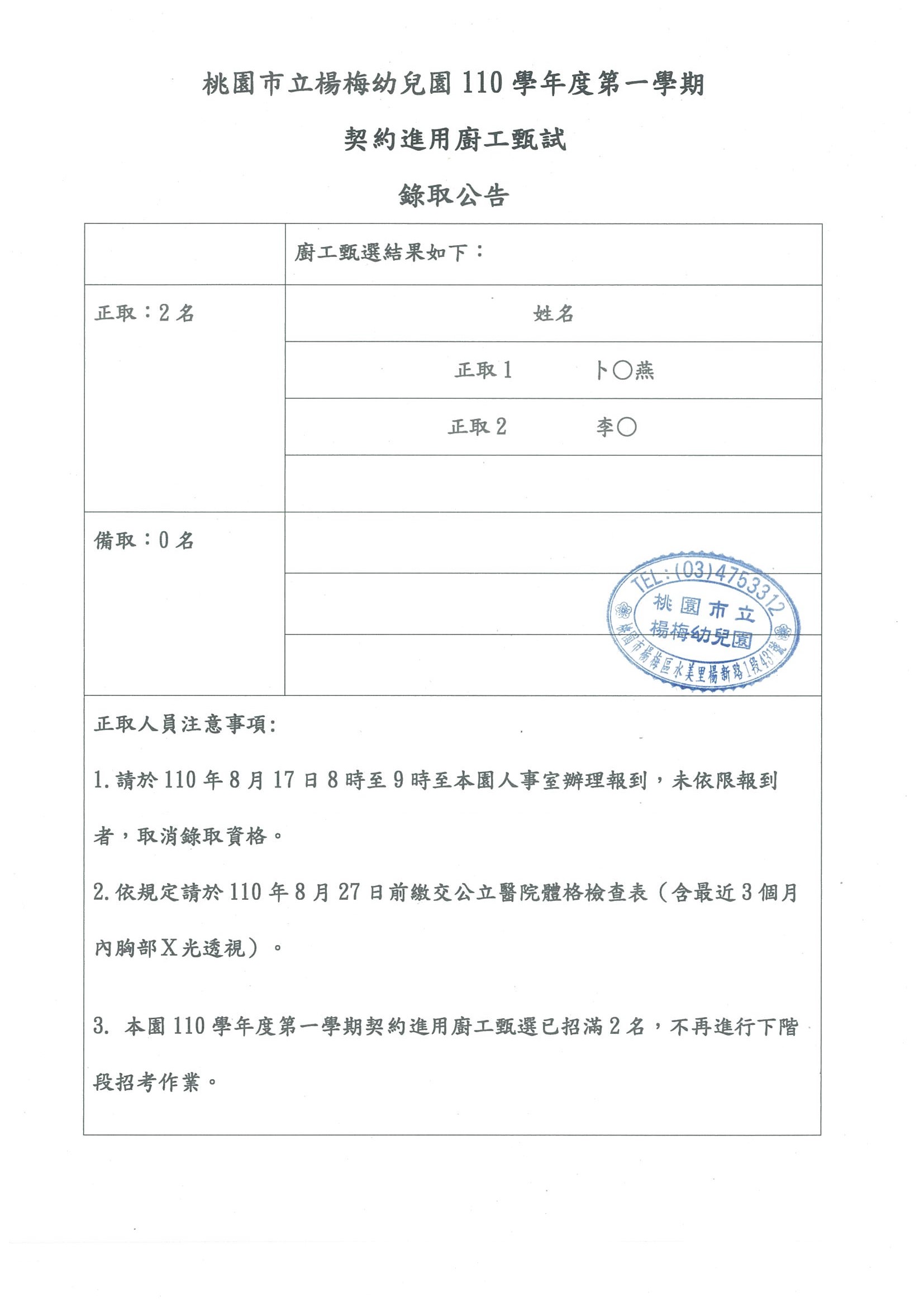 楊梅幼兒園110學年度第一學期契約進用廚工錄取公告