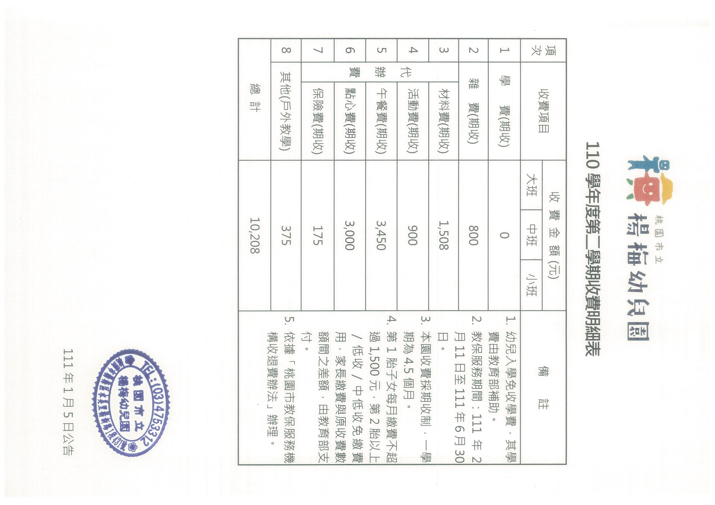 桃園市立楊梅幼兒園110學年度第二學期收費明細表
