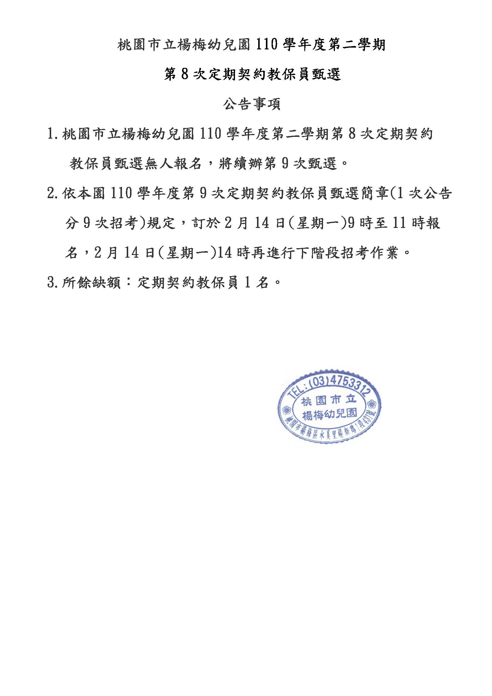 楊梅幼兒園110學年度第二學期第8次定期教保員無人應聘公告【缺額1名】