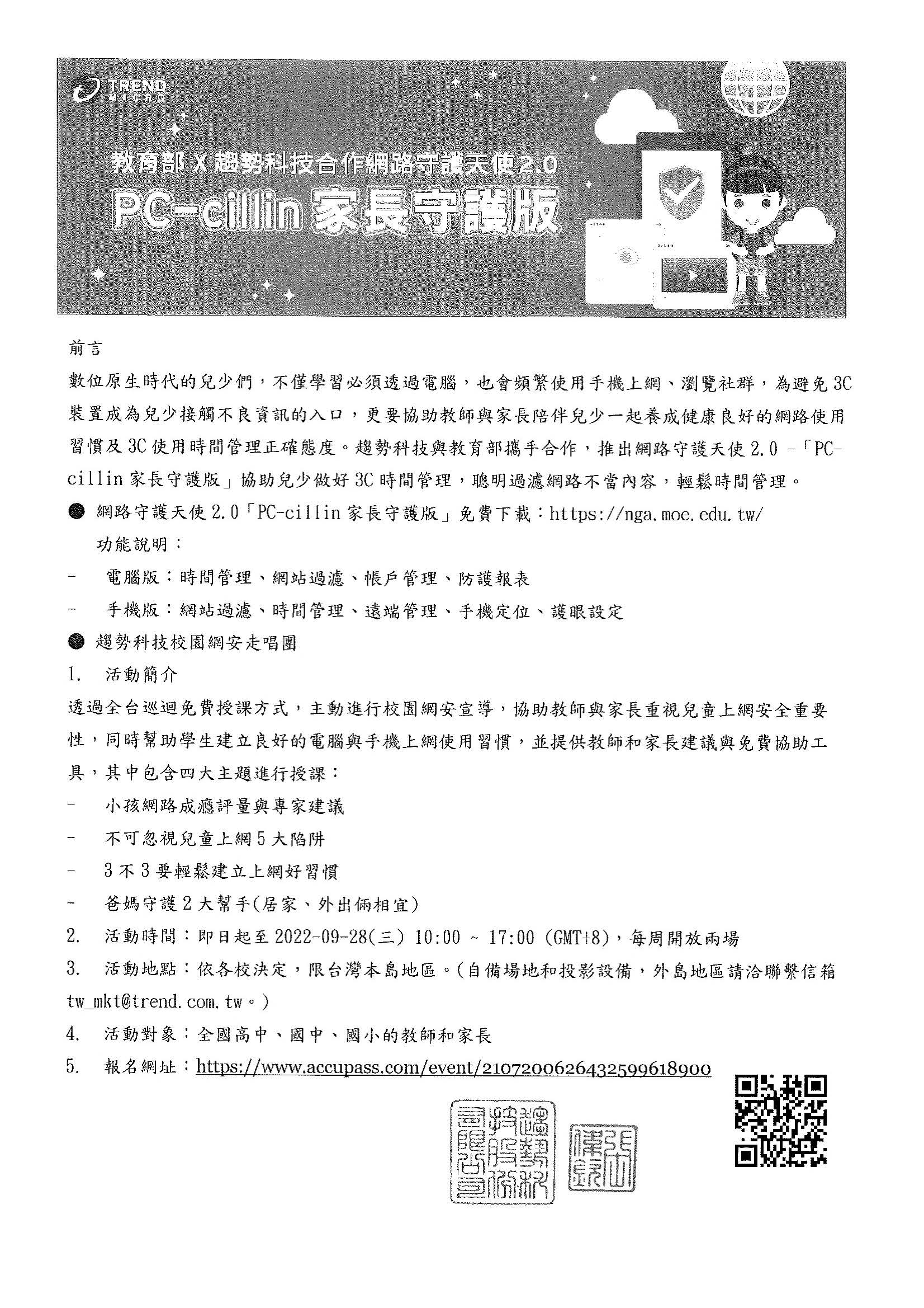 轉知:教育部宣導網路守護天使2.0「PC-cillin家長守護版」