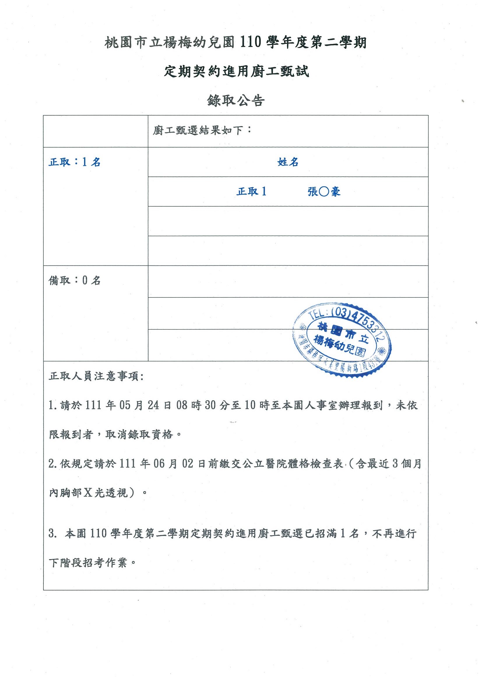 桃園市立楊梅幼兒園110學年度第二學期定期契約進用廚工錄取公告