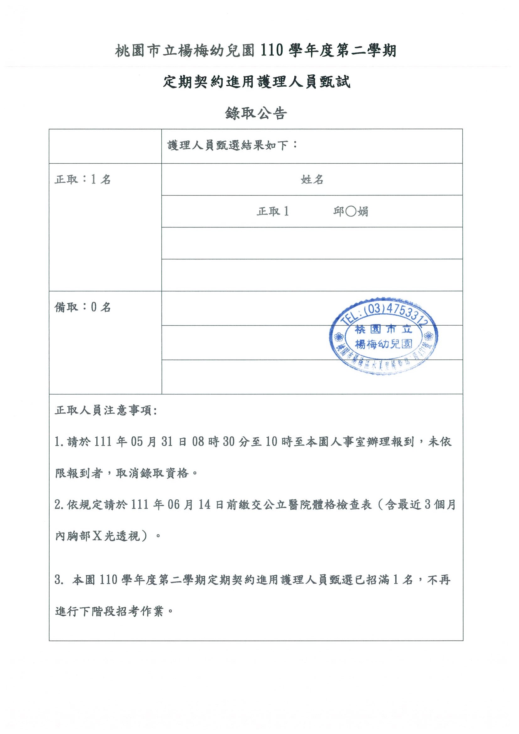 桃園市立楊梅幼兒園110學年度第二學期定期契約進用護理人員錄取公告