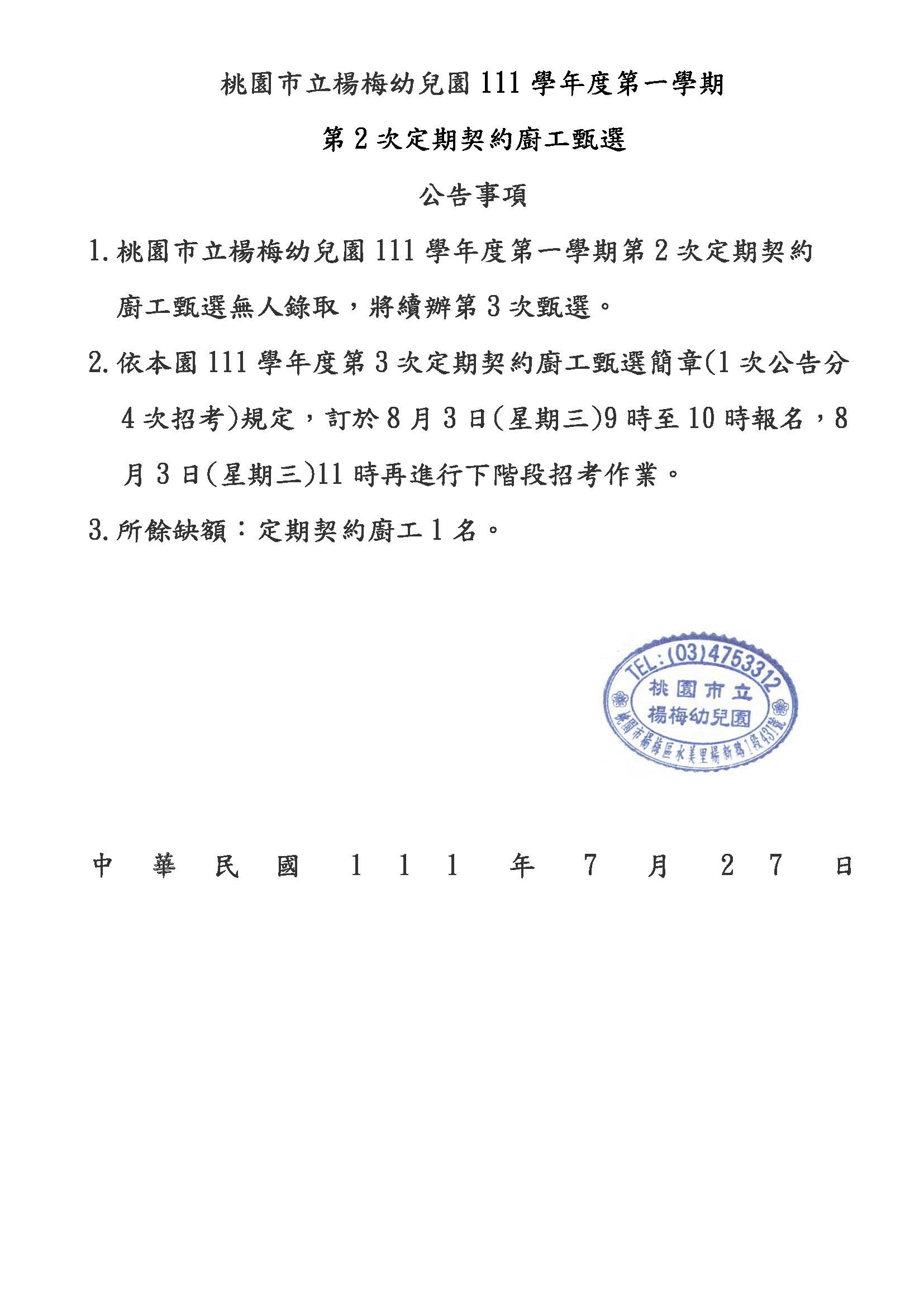 桃園市立楊梅幼兒園111學年度第一學期廚工無人報名公告續辦第3招