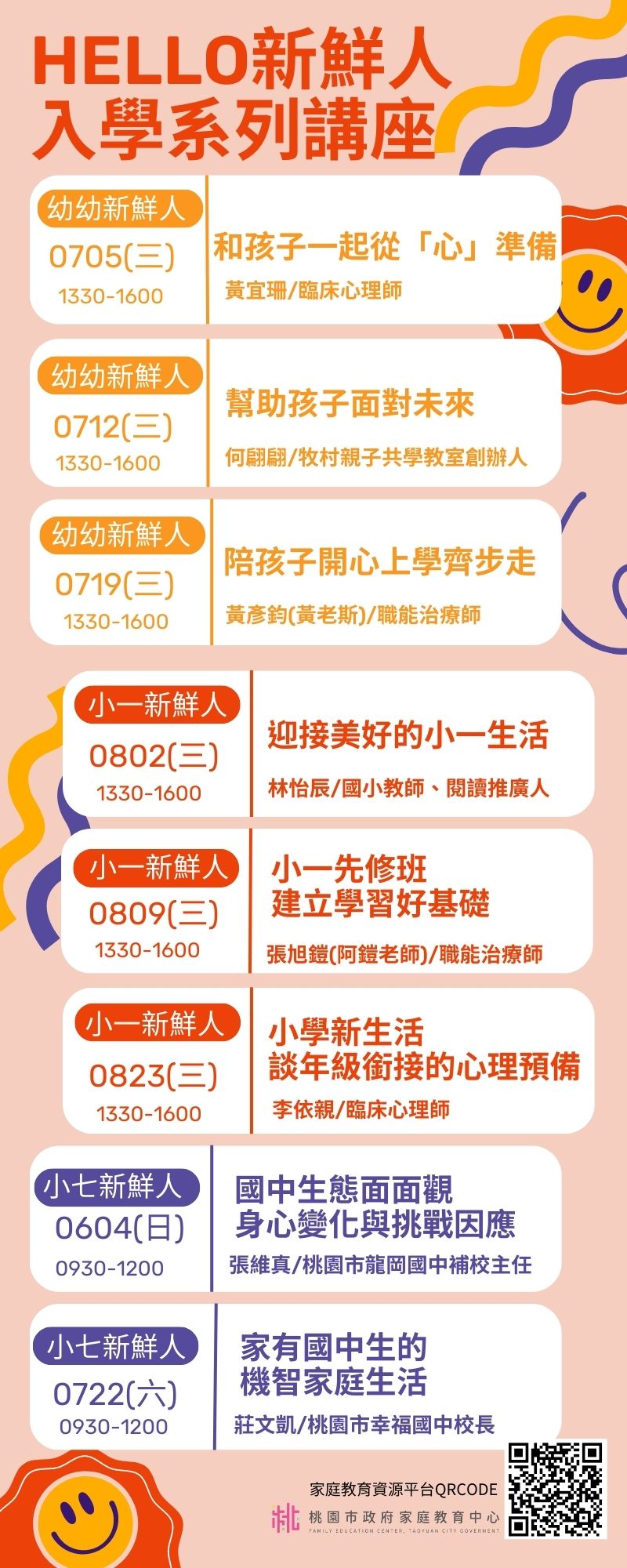 轉知:桃園市政府家庭教育中心「Hello!新鮮人入學系列講座」