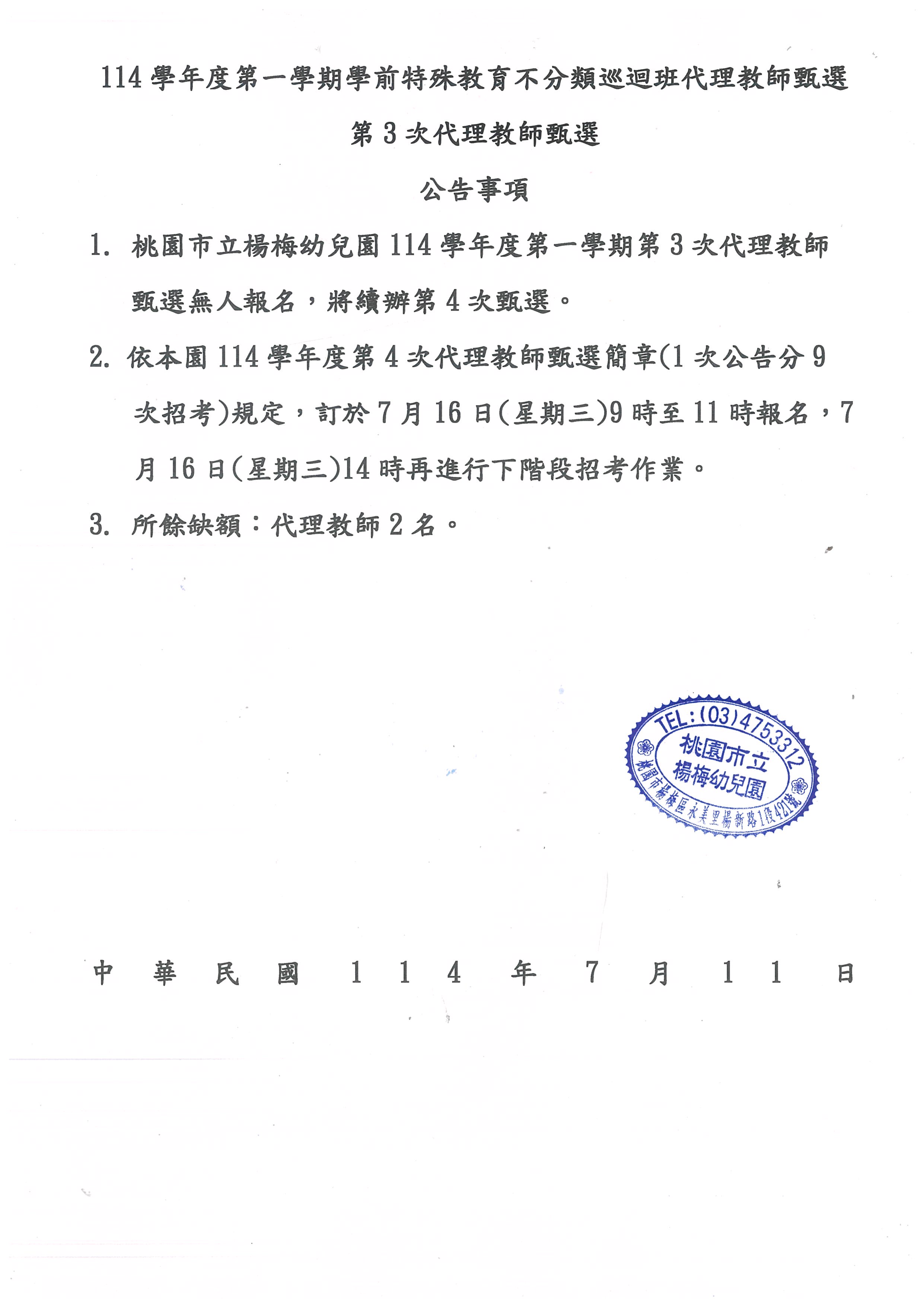 114學年度第一學期學前特殊教育不分類巡迴班代理教師甄選第3次代理教師甄選代理教師無人報名公告