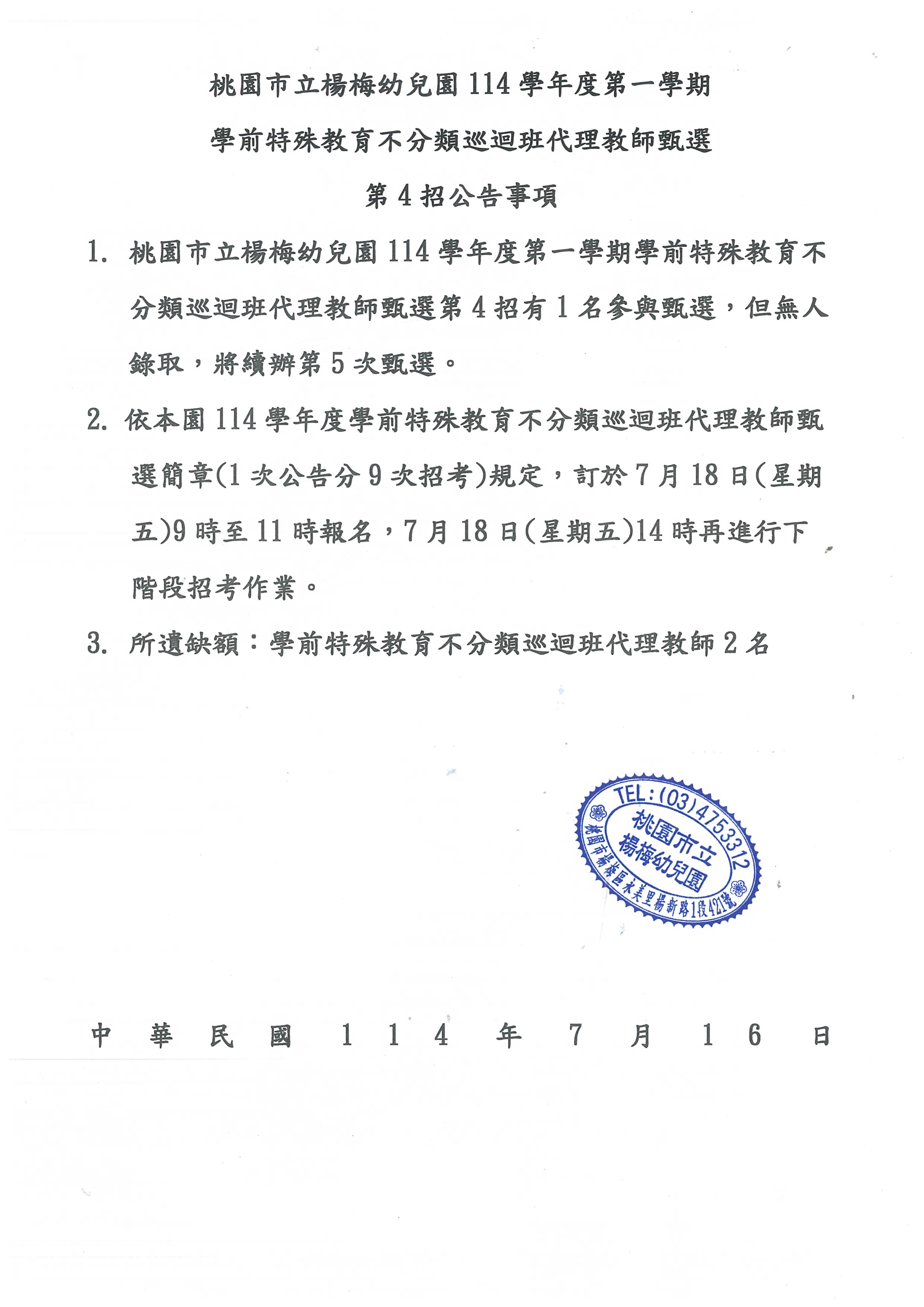 114學年度第一學期學前特殊教育不分類巡迴班代理教師甄選第4次代理教師甄選代理教師無人錄取公告