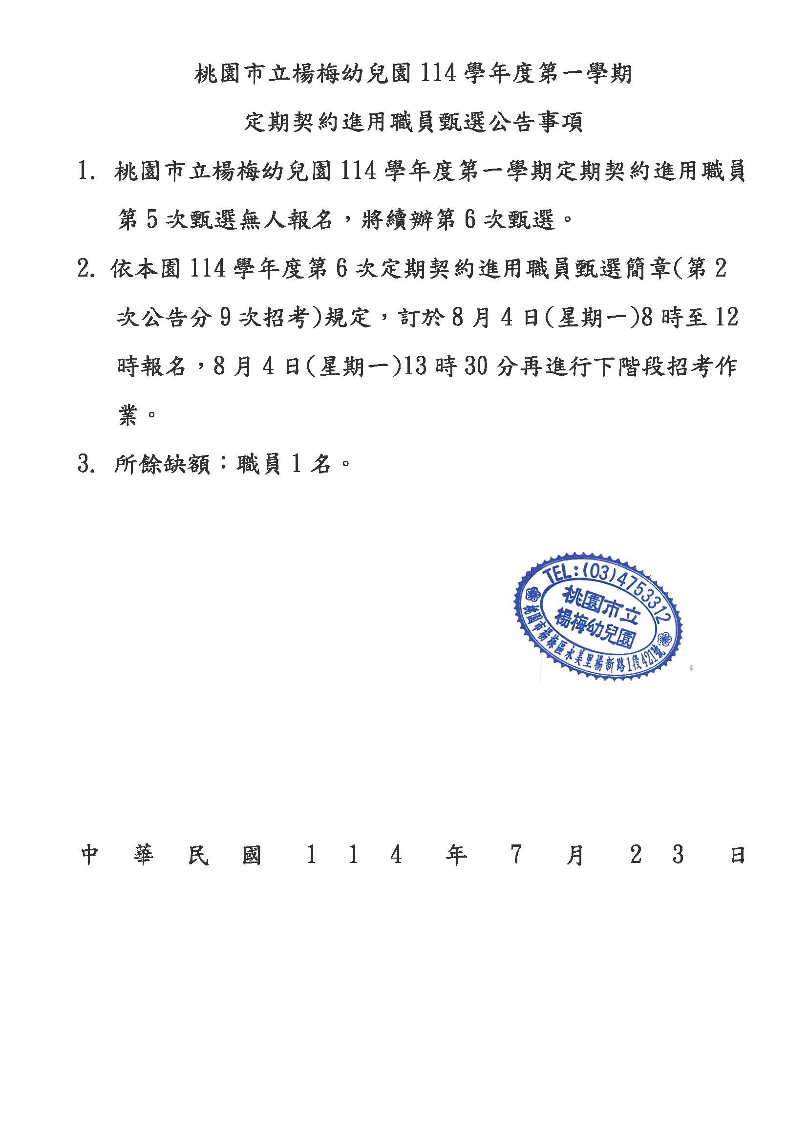 桃園市立楊梅幼兒園114學年度第一學期第5招定期契約進用職員無人報名公告