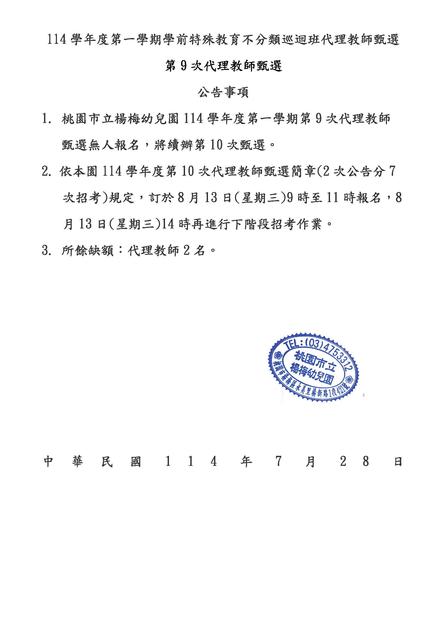 114學年度第一學期學前特殊教育不分類巡迴班代理教師甄選第9次代理教師甄選代理教師無人報名公告