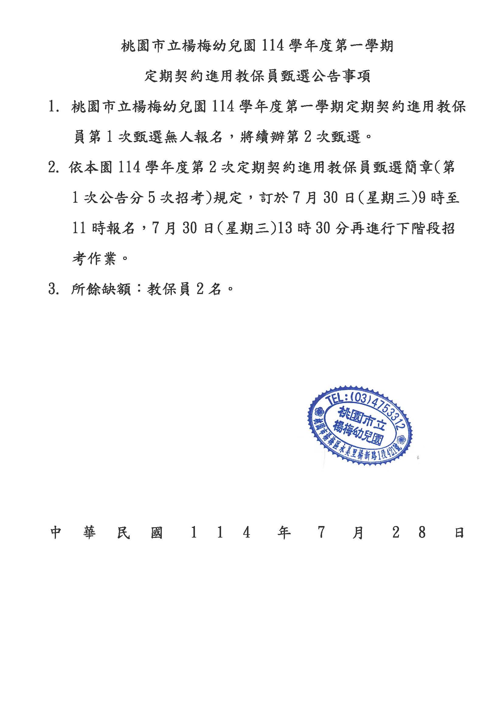 桃園市立楊梅幼兒園114學年度第一學期第1招定期契約進用教保員無人報名公告