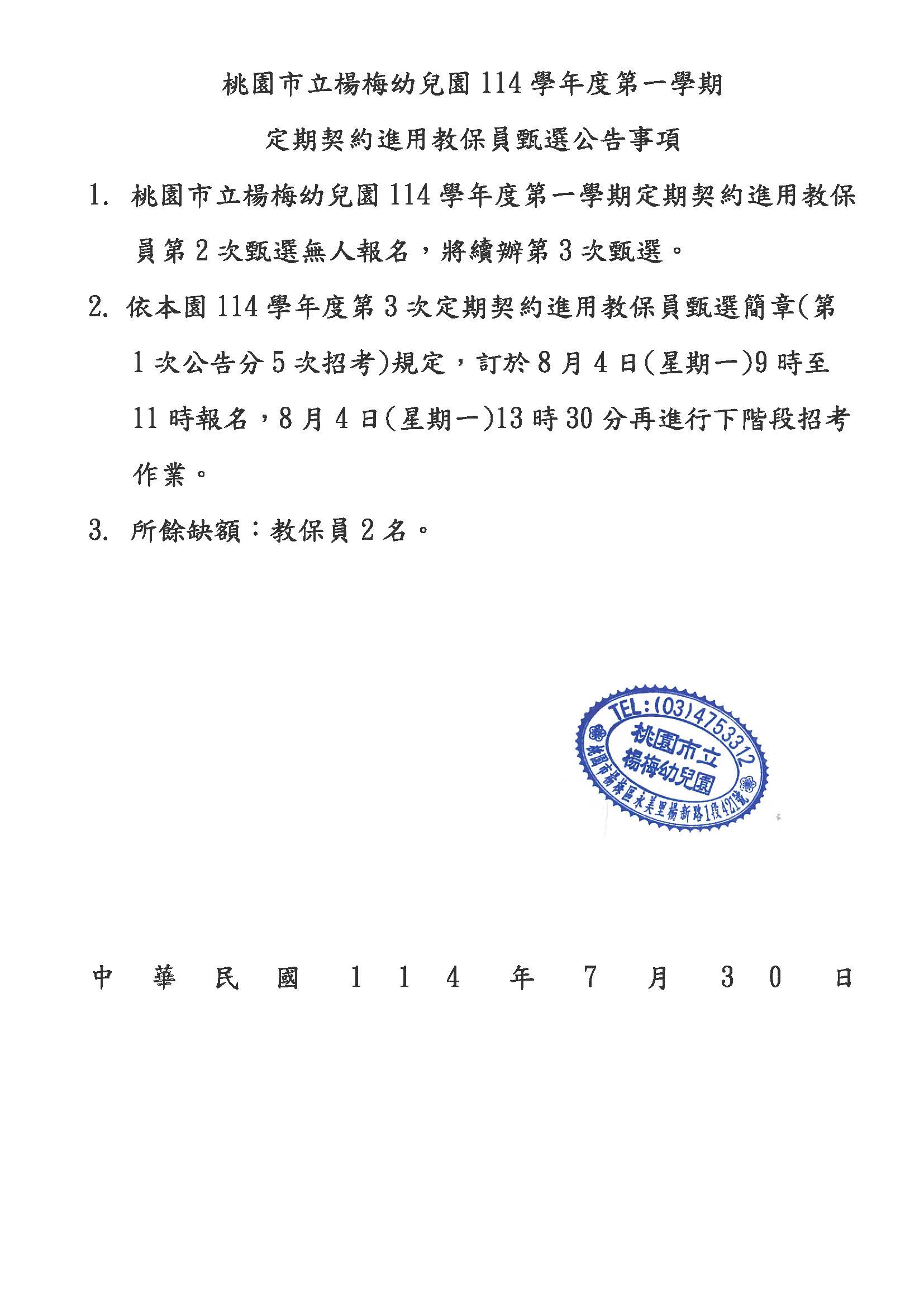 桃園市立楊梅幼兒園114學年度第一學期第2招定期契約進用教保員無人報名公告