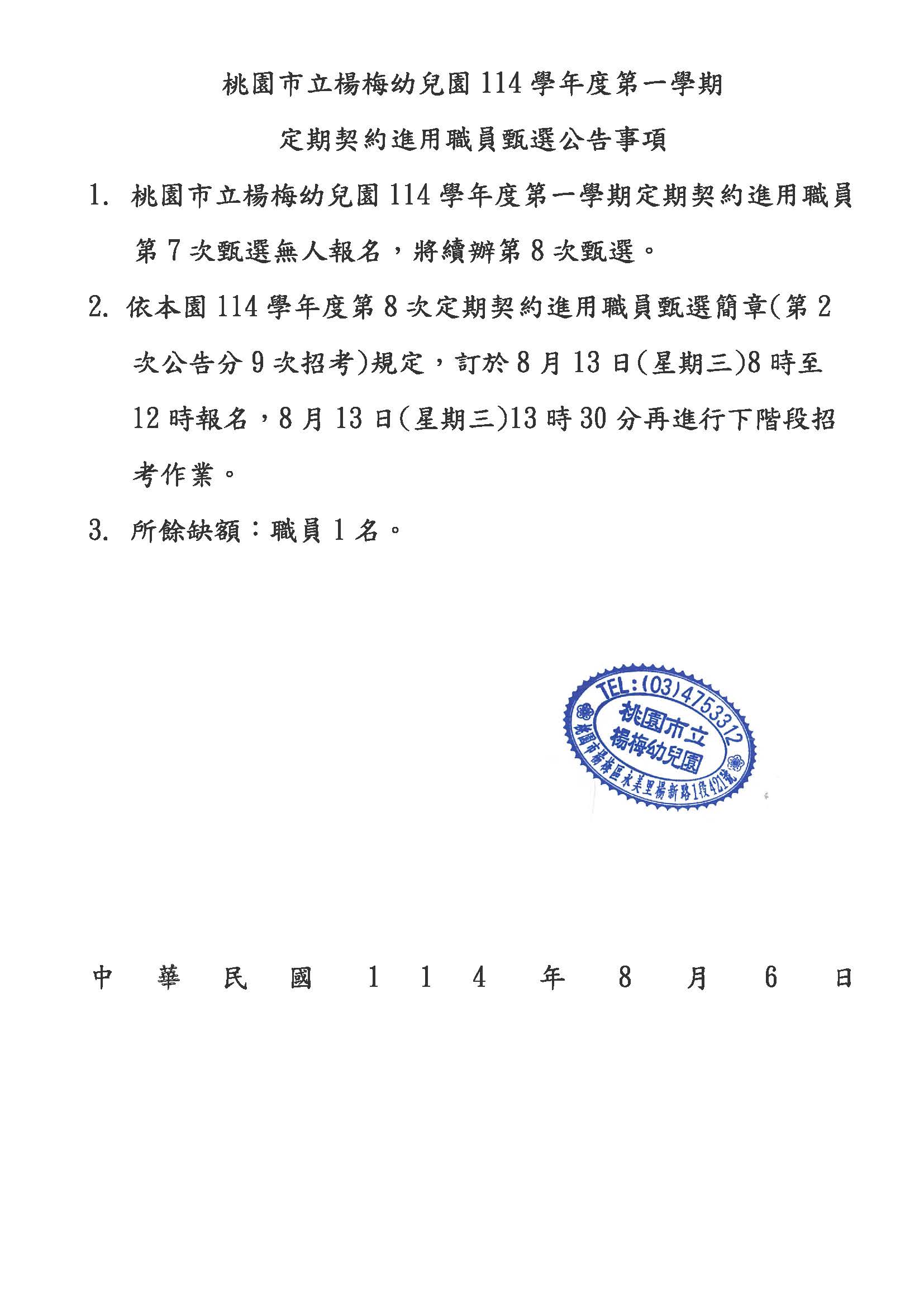 桃園市立楊梅幼兒園114學年度第一學期第7招定期契約進用職員無人報名公告
