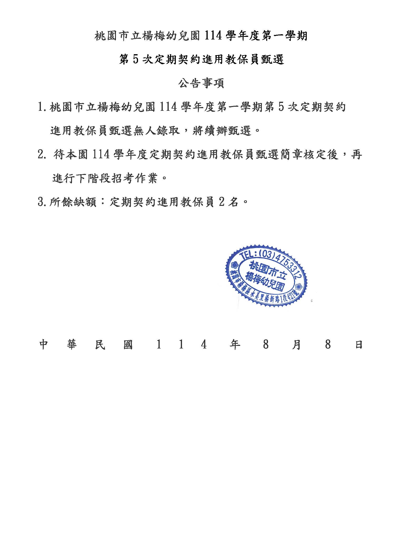 桃園市立楊梅幼兒園114學年度第一學期第5招定期契約進用教保員無人錄取公告