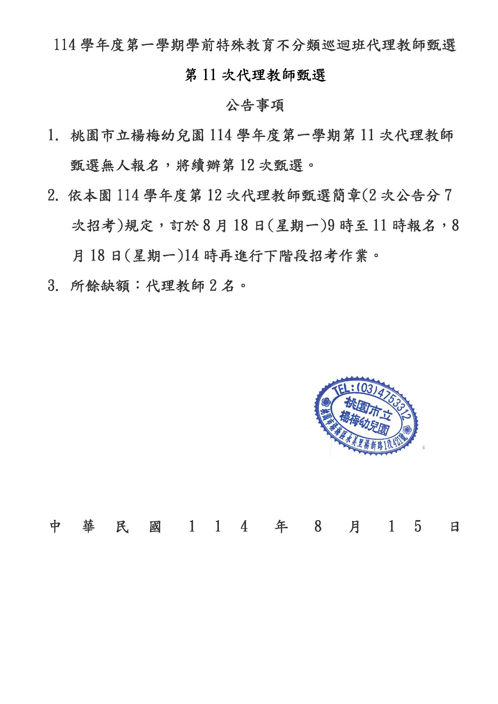 114學年度第一學期學前特殊教育不分類巡迴班代理教師甄選第11次代理教師甄選代理教師無人報名公告