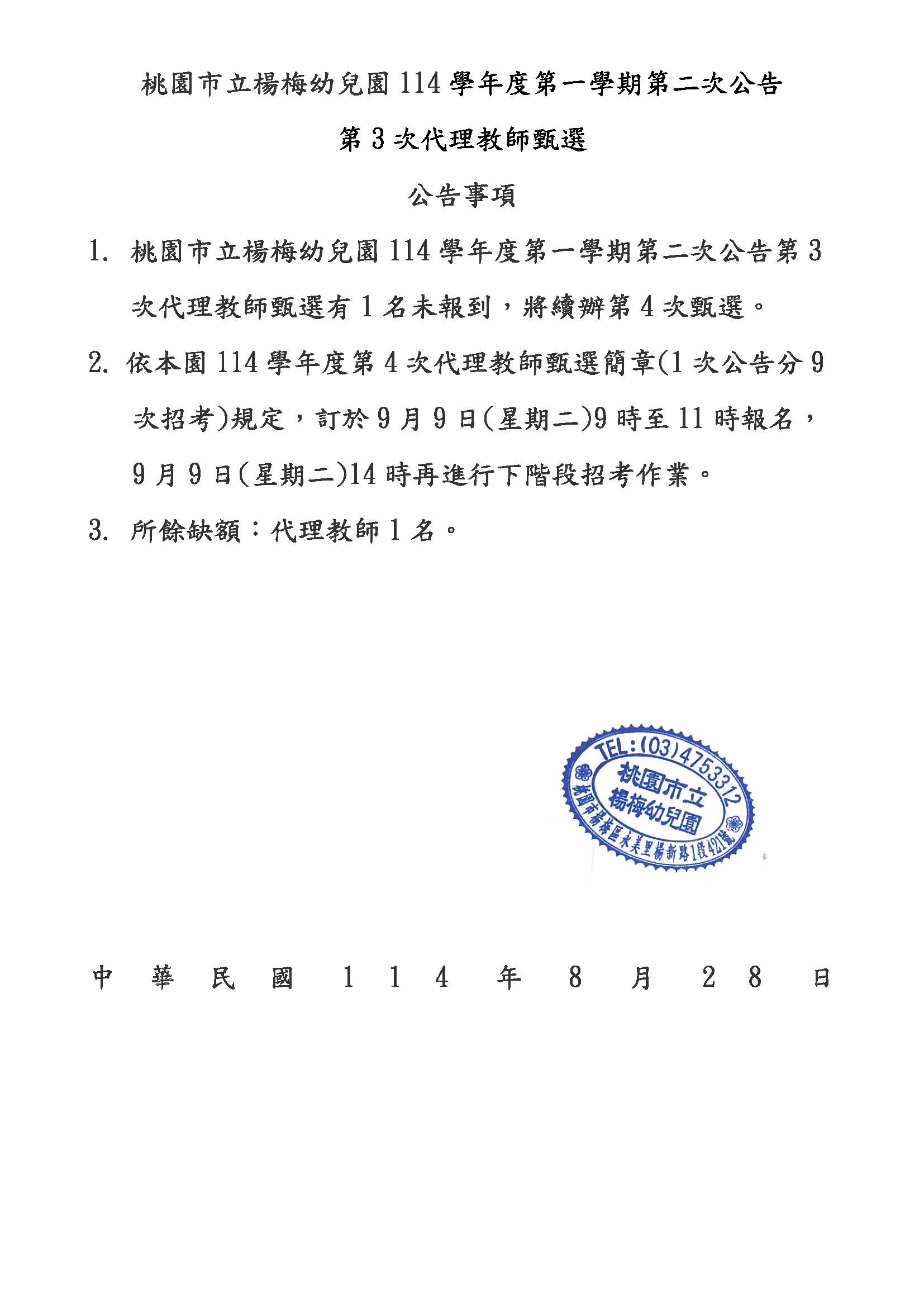 桃園市立楊梅幼兒園114學年度第一學期第二次第3招代理教師錄取未報到公告